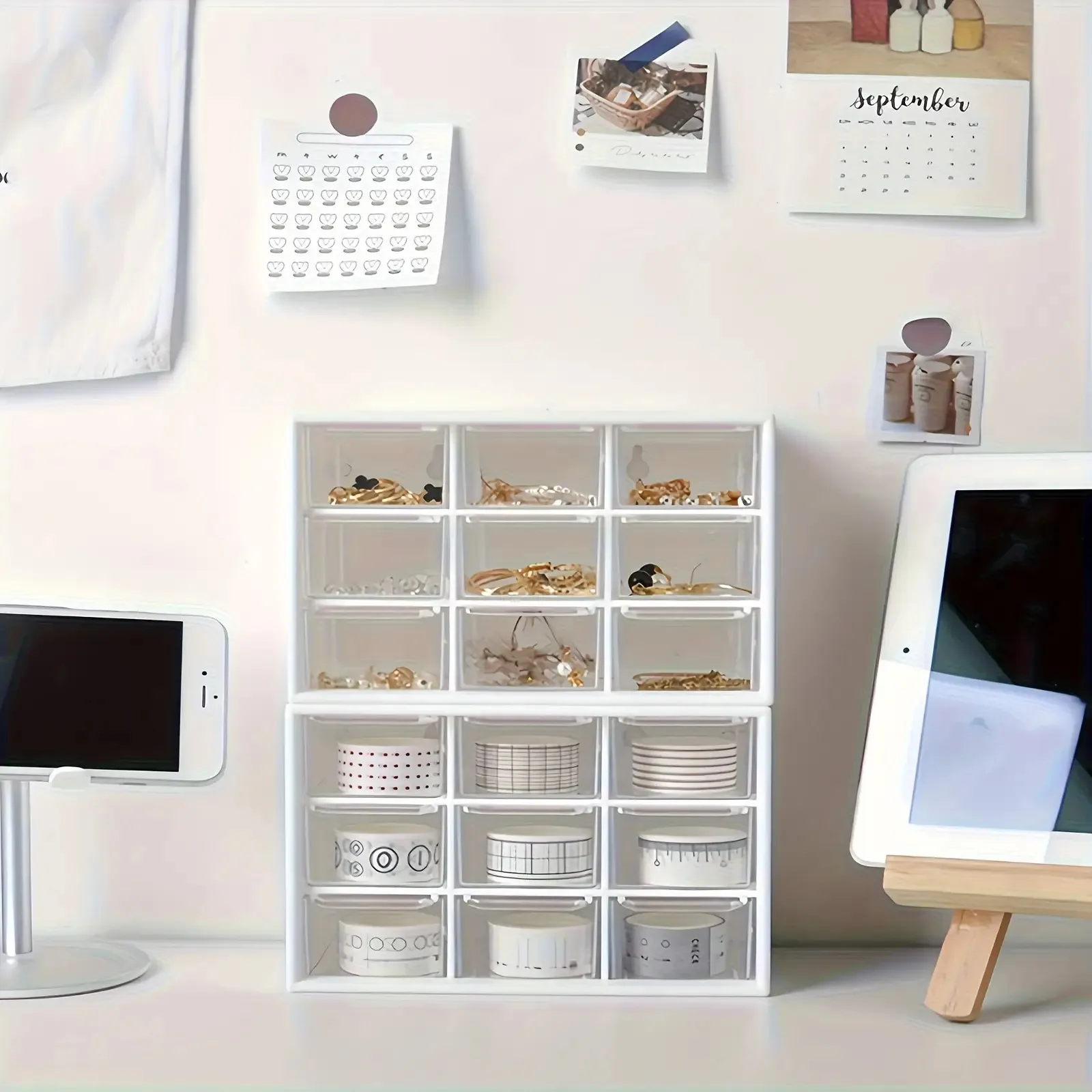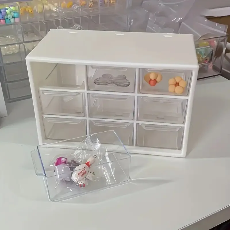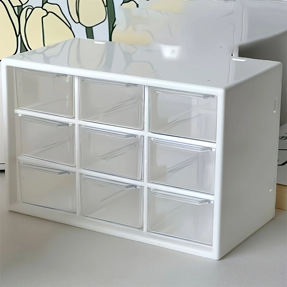 Caja de almacenamiento de material de cuentas. La caja de almacenamiento estilo cajón de nueve rejillas es apilable. Organizador de maquillaje para tocador y oficina
