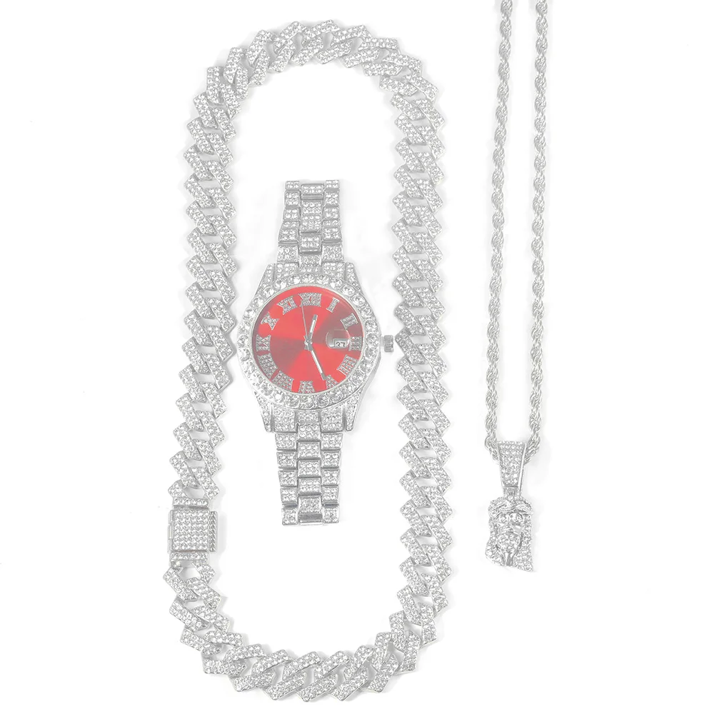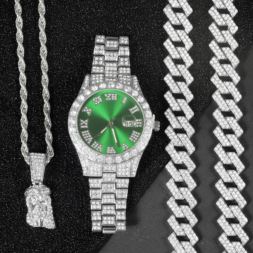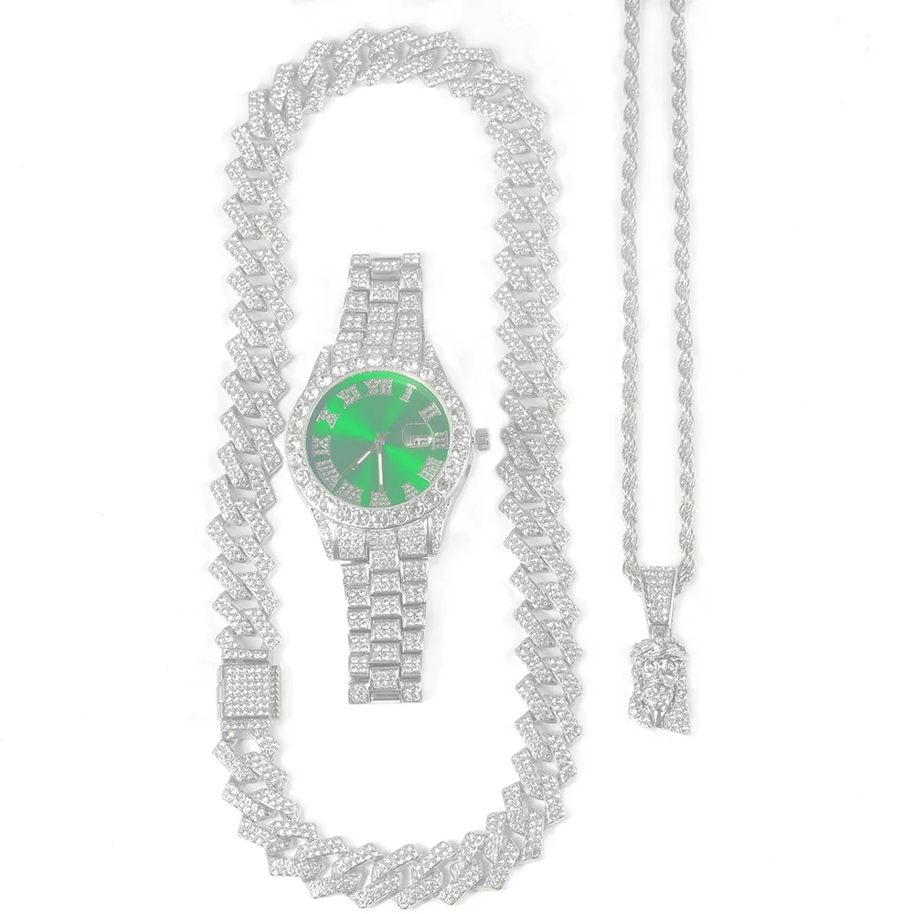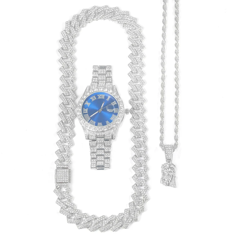 Conjunto de joyería de reloj de Hip-hop para hombres y mujeres, reloj de diamantes Punk Iced Out, cadena cubana, collar con colgante de Jesús, conjunto de regalo de tendencia elegante
