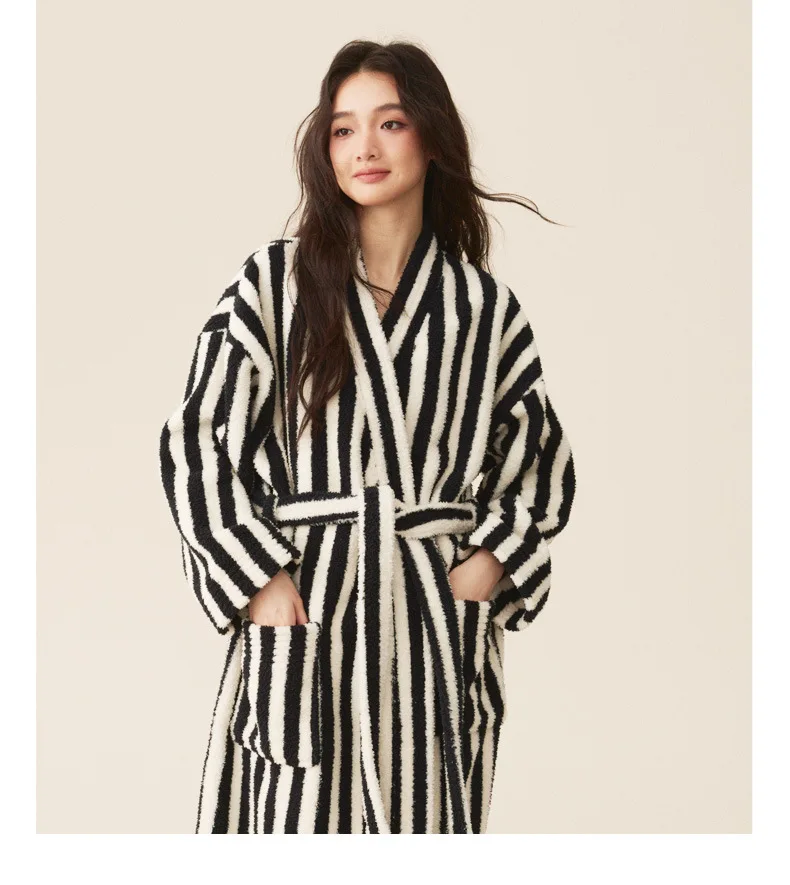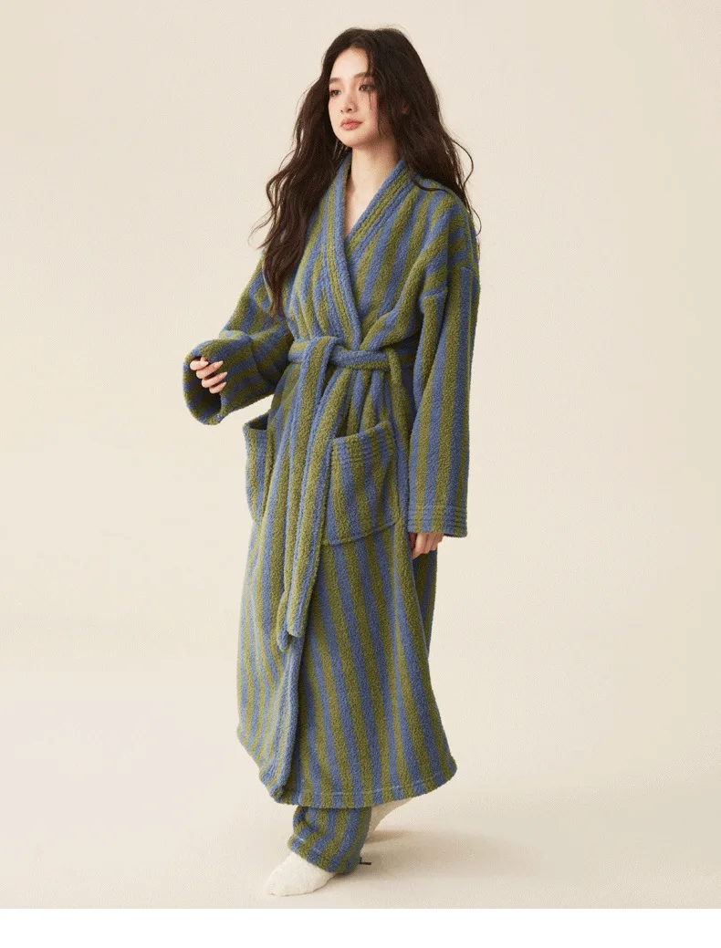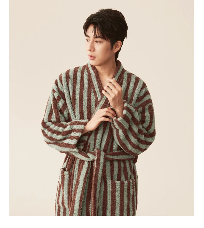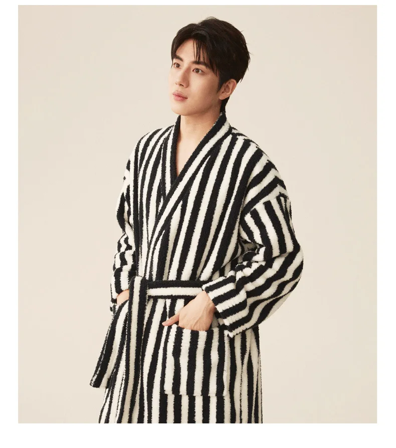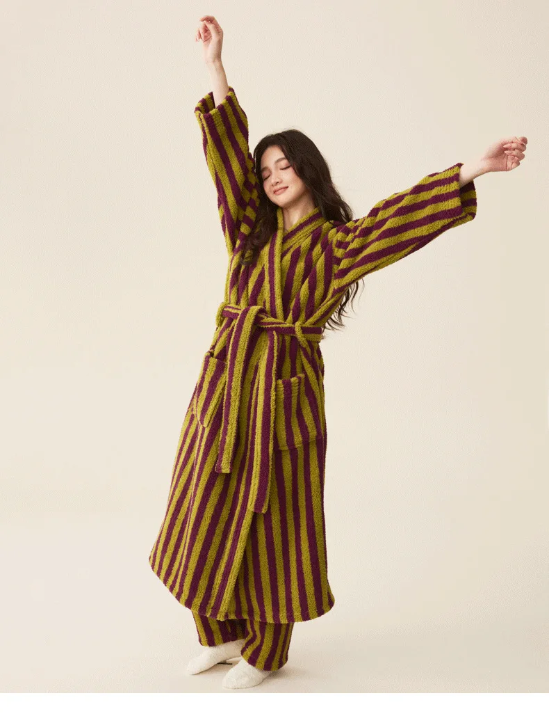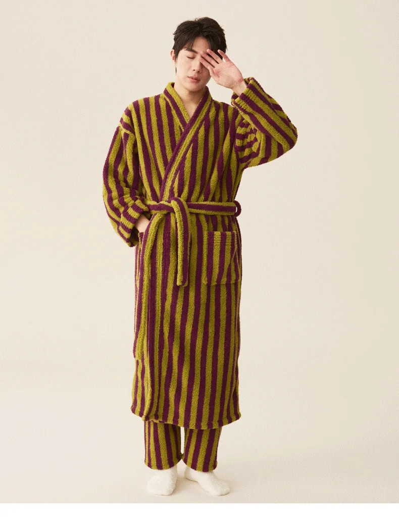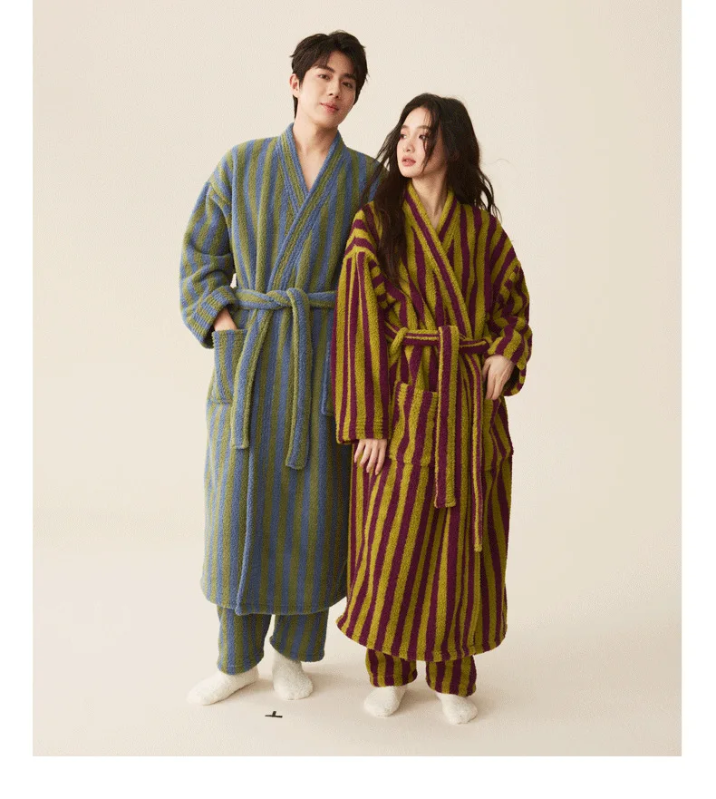 Conjunto de pijamas de franela gruesa para hombre y mujer, bata de baño de terciopelo Coral para otoño e invierno, ropa de hogar larga a rayas