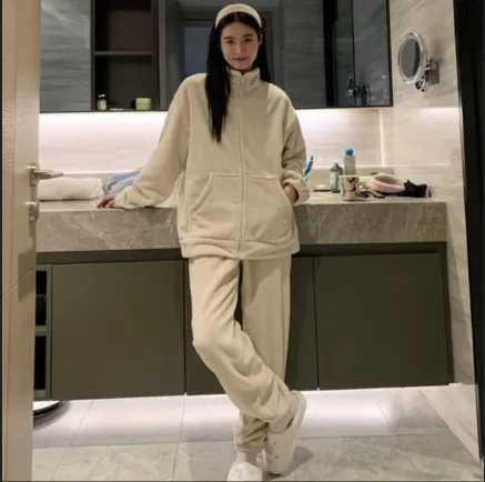 Conjunto de Pijamas de invierno para mujer, ropa de dormir cálida de lana de Coral, traje de pantalón con bolsillo, franela gruesa suelta, cuello alto, ropa de casa