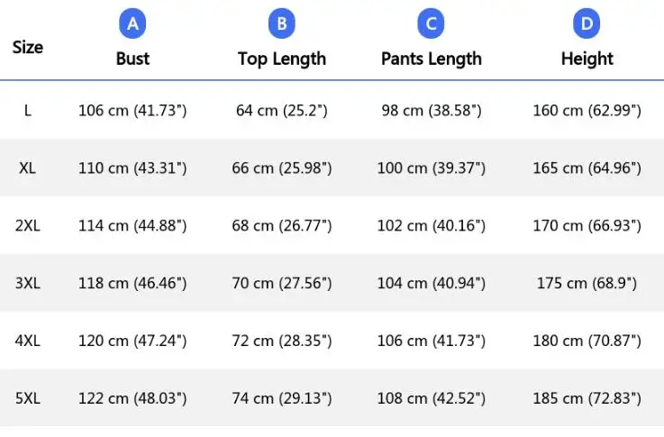 Talla 5XL: busto 122 cm (48,03''), largo de la parte superior 74 cm (29,13''), largo de los pantalones 108 cm (42.52''), alto 185 cm (72,83'')