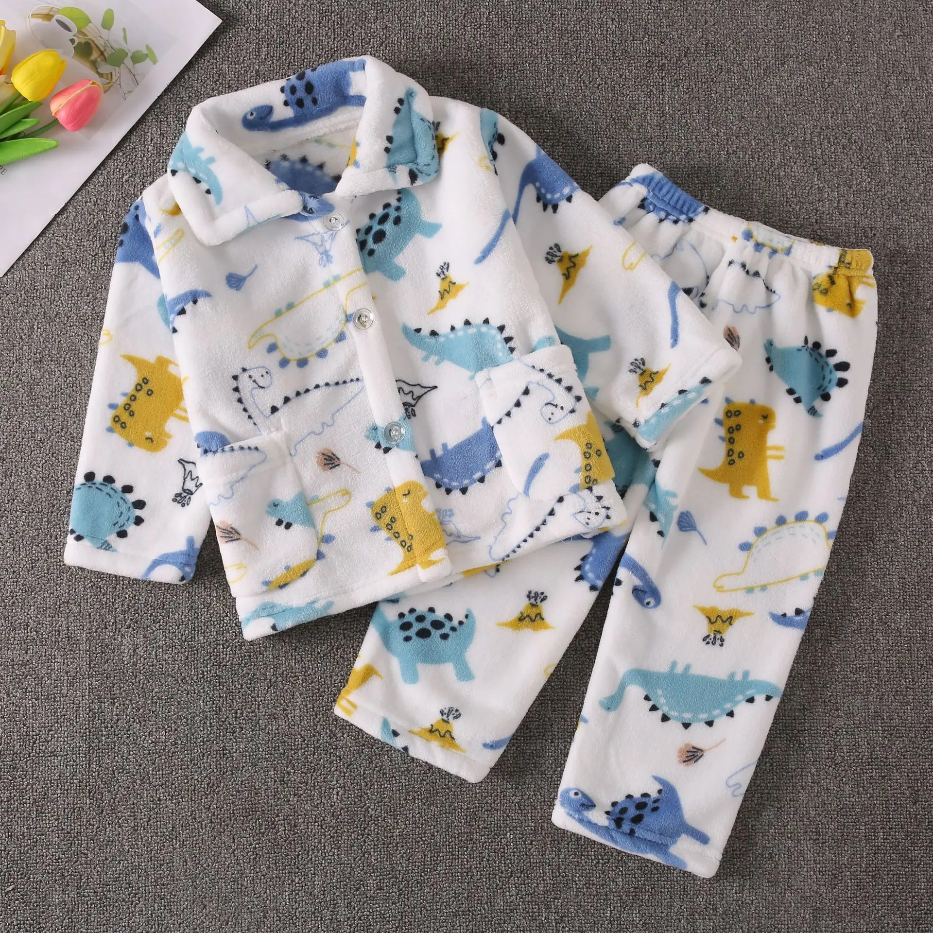 Conjuntos de pijamas cálidos de Franela suave para niños, abrigo con solapa de dibujos animados bonitos y pantalones, ropa de dormir informal para niños, Otoño e Invierno