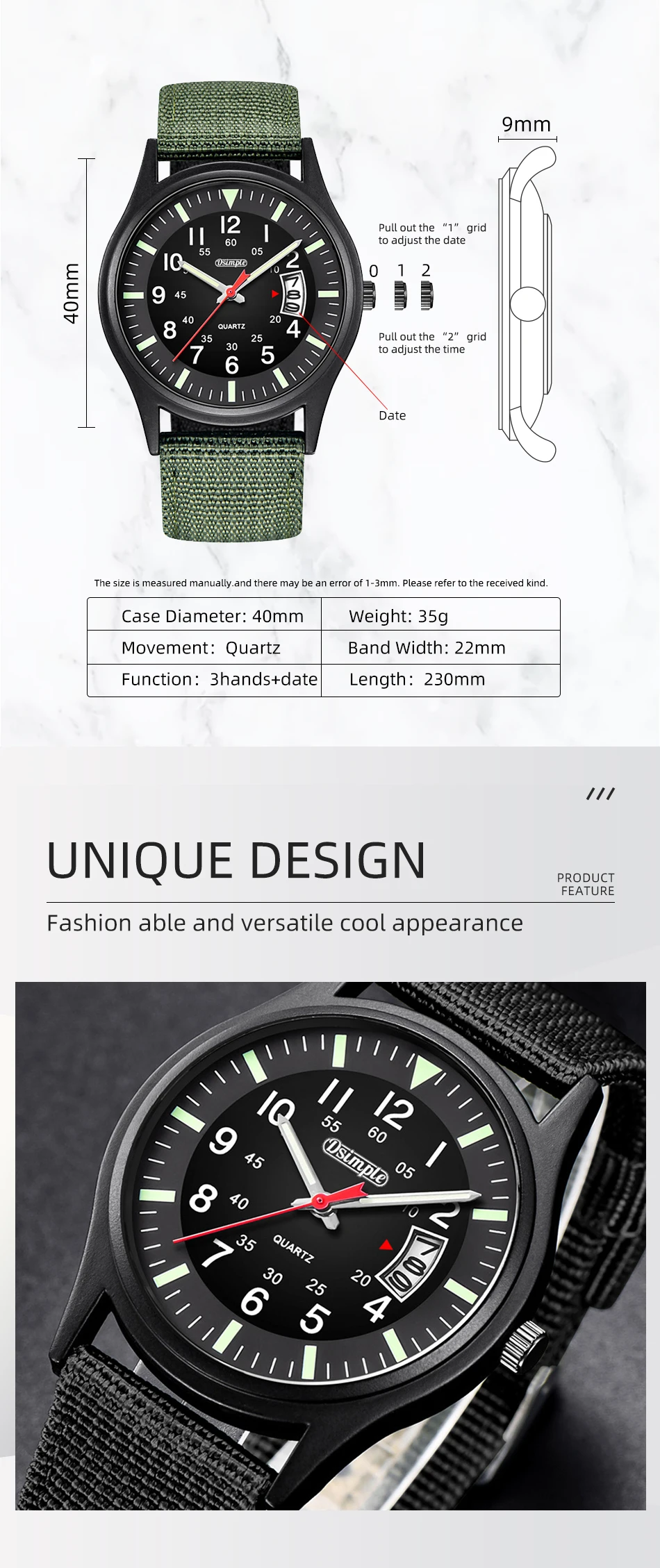 • Movimiento de cuarzo :El movimiento de cuarzo garantiza el cronometraje preciso y la fiabilidad del reloj.