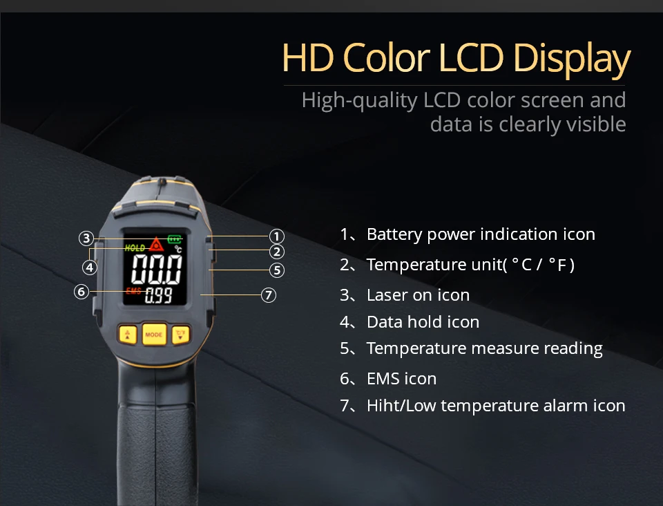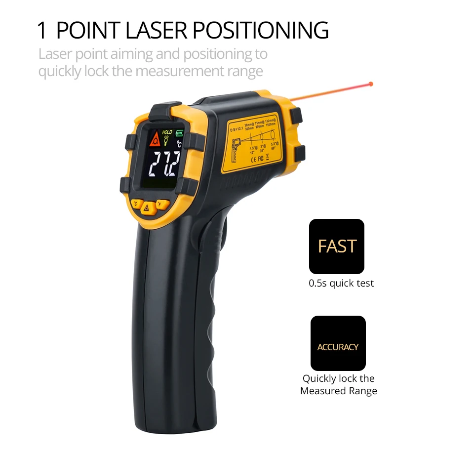 Este termómetro infrarrojo sin contacto digital es una pistola de medición de temperatura industrial confiable utilizada para medir la temperatura de la superficie de un objeto de forma segura y rápida en menos de un segundo. Puede ser ampliamente utilizado en la industria del petróleo y química, ferrocarril, electricidad, Procesamiento textil, etc.