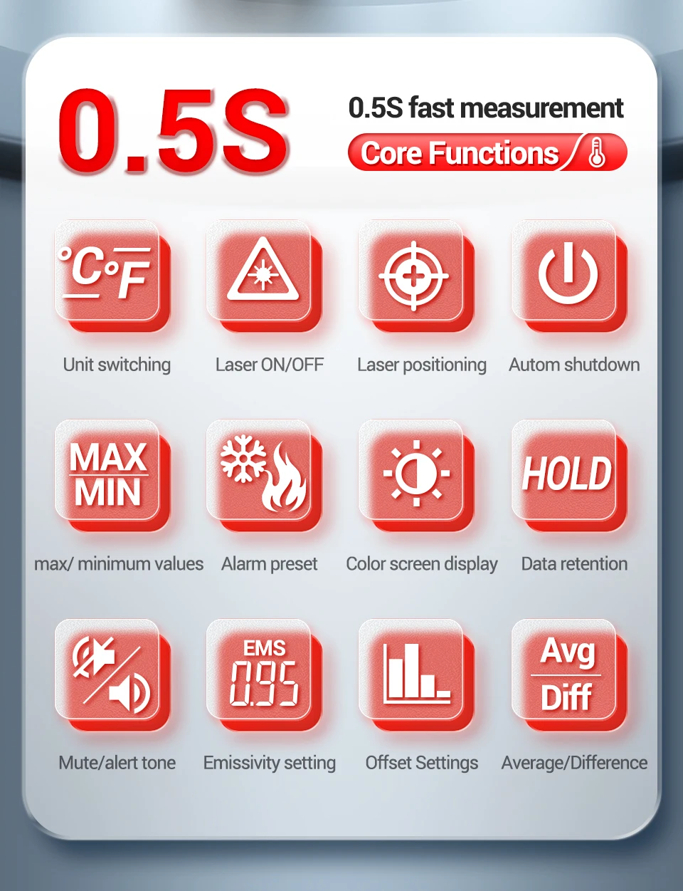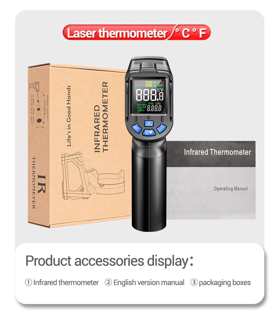 Este termómetro es un termómetro de rediación de funcionamiento (en lo sucesivo denominado producto) que puede determinar su temperatura de la superficie midiendo la energía infrarroja revisada desde la superficie del cuerpo objetivo.