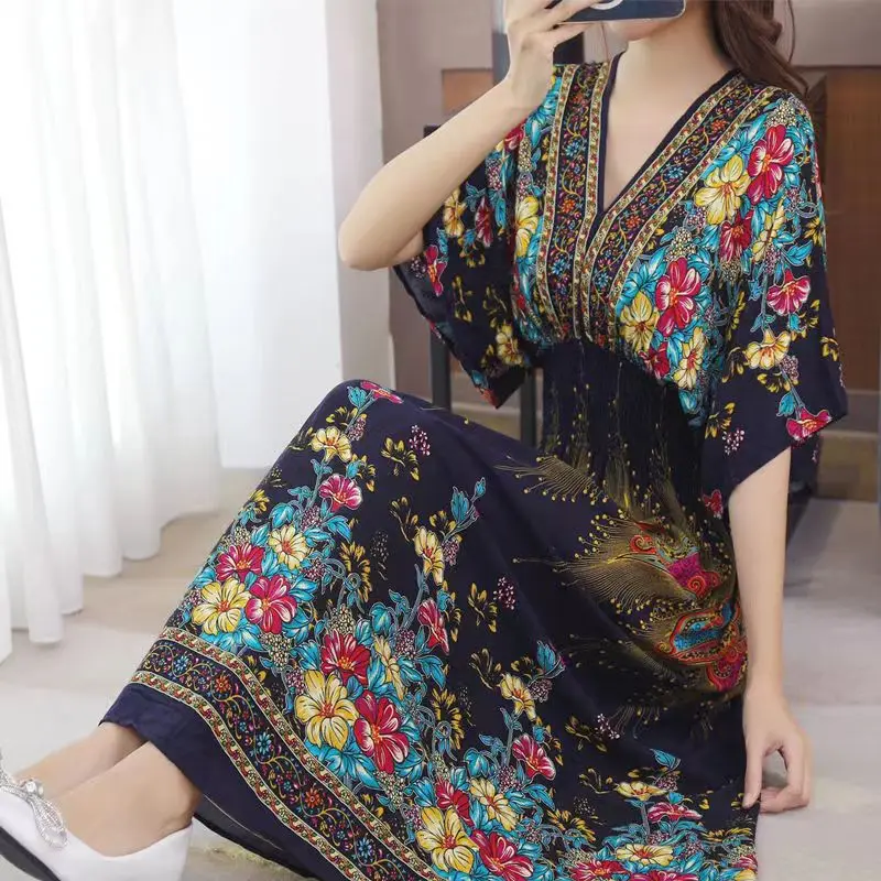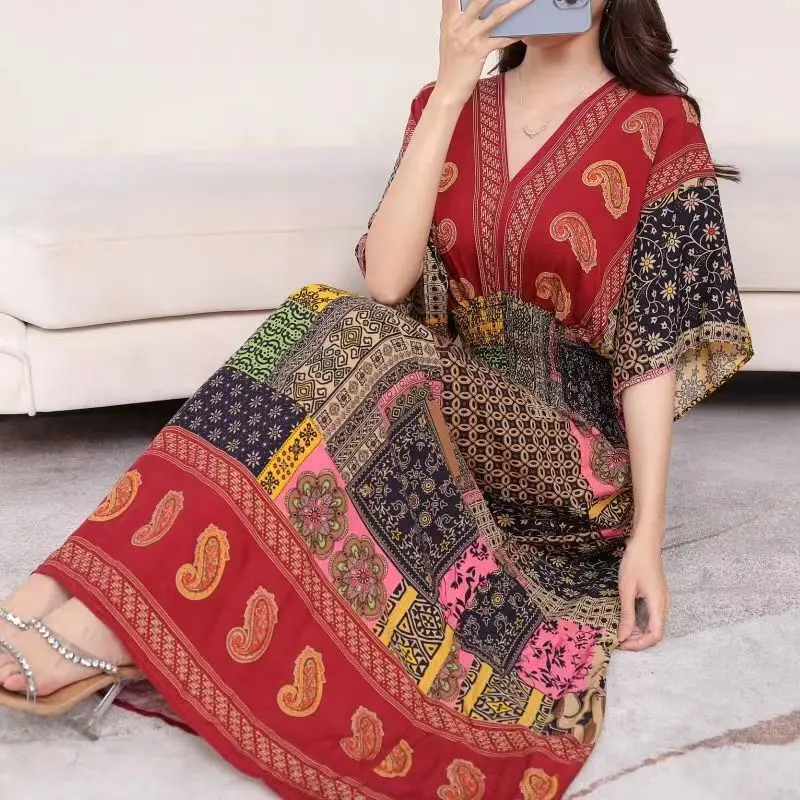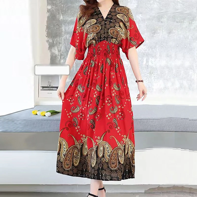 Vestido largo de cuerda Para Mujer, traje bohemio con cuello en V, estilo Retro, informal, estampado coreano, Verano